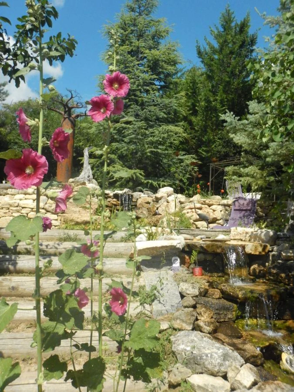 Espaces communs : salon avec poêle à bois, terrasses en restanques, jardin
