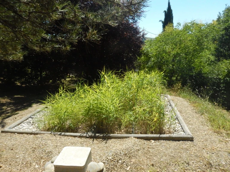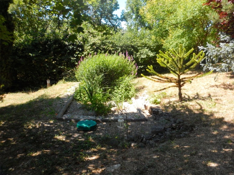 Le premier bassin, vertical, contient des roseaux qui traitent les eaux usées domestiques. Après cette première filtration, l'eau passe dans un second bassin, horizontal, planté d'un mélange de plantes aquatiques dépuratives. Elle en ressort propre et sert à arroser les arbres du jardin. Le bassin est aussi esthétique qu'efficace : iris d'eau, menthe aquatique, joncs et crucéria y fleurissent. Les papillons et les oiseaux y ont élu domicile.